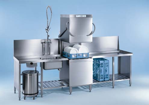 È una macchina a passaggio dall'eccezionale resa per lavare grandi quantità di stoviglie in tempi brevi. È dotata di capote con maniglie funzionali e può essere posizionata liberamente in linea oppure ad angolo con un minimo ingombro per adattarsi alle procedure di lavoro. Viene fornita con rivestimento esterno in acciaio inossidabile, senza cesti. Vasca di lavaggio in acciaio inox a forma di L senza spigoli né angoli, con resistenza di riscaldamento piatta, per facilitare la pulizia e assicurare l'igiene della vasca. Non si forma né sporco né calcare. Sistema a bracci irroratori rotanti (sopra e sotto) per il lavaggio e per il risciacquo. Boiler integrato (capacità: 12 l) per riscaldare l'acqua di risciacquo e pompa per l'aumento della pressione, per ottenere risultati ottimali di lavaggio e di risciacquo a prescindere dalla pressione dell'acqua di rete. A seconda del modello dotata di dispositivi di dosaggio di serie e o di predisposizione per l'allacciamento di pompe di dosaggio per prodotti liquidi. Pompa di dosaggio per brillantante con segnalazione svuotamento. Sistema a 4 filtri (cassetta filtro per sporco più grossolano, filtro di grande superficie, filtro pompa di circolazione, filtro liscivia per separare le particelle di sporco). Possibilità di allacciamento all'acqua calda per ridurre i tempi di funzionamento della macchina. Sistema a liscivia unica, per un uso continuativo, grazie al grande serbatoio di acqua capace di contenere 42 l di liscivia. Comando elettronico con tasti, sensori e LED di indicazione. Comando a selettore unico con indicatori di funzionamento in diversi colori. - Durata di lavaggio più breve: 60 sec./carico (con allacciamento all'acqua calda 60°C)