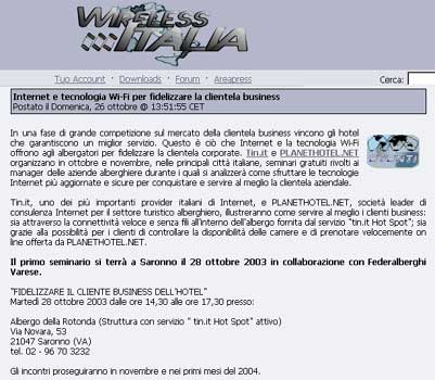 In una fase di grande competizione sul mercato della clientela business vincono gli hotel che garantiscono un miglior servizio. Questo è ciò che Internet e la tecnologia Wi-Fi offrono agli albergatori per fidelizzare la clientela corporate. Tin.it e PLANETHOTEL.NET organizzano in ottobre e novembre, nelle principali città italiane, seminari gratuiti rivolti ai manager delle aziende alberghiere durante i quali si analizzerà come sfruttare le tecnologie Internet più aggiornate e sicure per conquistare e servire al meglio la clientela aziendale.