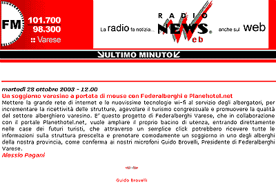 Mettere la grande rete di internet e le nuovissime tecnologie wi-fi al servizio degli albergatori, per incrementare la ricettivitą delle strutture, agevolare il turismo congressuale e promuovere la qualitą del settore alberghiero varesino. E' questo progetto di Federalberghi Varese, che in collaborazione con il portale PLANETHOTEL.NET, vuole ampliare il proprio bacino di utenza, entrando direttamente nelle case dei futuri turisti, che attraverso un semplice click potrebbero ricevere tutte le informazioni sulla struttura prescelta e prenotare comodamente un soggiorno in uno degli alberghi della nostra provincia, come conferma ai nostri microfoni Guido Brovelli, Presidente di Federalberghi Varese.