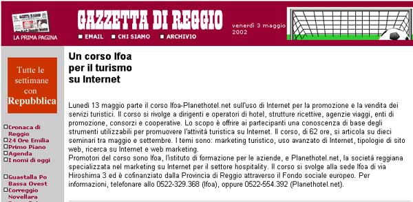 Promotori del corso sono Ifoa, l'istituto di formazione per le aziende, e PLANETHOTEL.NET, la società reggiana specializzata nel marketing su Internet per il settore hospitality. Il corso si svolge alla sede Ifoa di via Hiroshima 3 ed è cofinanziato dalla Provincia di Reggio attraverso il Fondo Sociale Europeo. Per informazioni, telefonare allo 0522 329368 (Ifoa), oppure allo 0522 554392 (PLANETHOTEL.NET).