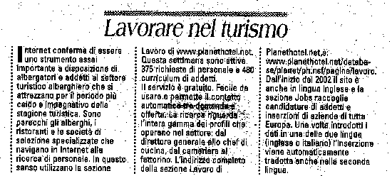 Internet conferma di essere uno strumento assai importante a disposizione di albergatori e addetti al settore turistico alberghiero che si attrezzano per il periodo più caldo e impegnativo della stagione turistica. Sono parecchi gli alberghi, i ristoranti e le società di selezione specializzate che navigano in Internet alla ricerca di personale. In questo senso utilizzano la sezione Lavoro di www.planethotel.net. Questa settimana sono attive 375 richieste di personale e 480 curriculum di addetti. Il servizio è gratuito. Facile da usare e permette il contatto automatico tra domanda e offerta. La ricerca riguarda l'intera gamma dei profili che operano nel settore: dal direttore generale allo chef di cucina, dal cameriere al fattorino. L'indirizzo completo della sezione Lavoro di Planethotel.net è: www.planethotel.net/database/planet/ph.nsf/pagine/lavoro. Dall'inizio del 2002 il sito è anche in lingua inglese e la sezione Jobs raccoglie candidature di addetti e inserzioni di aziende di tutta Europa. Una volta introdotti i dati in una delle due lingue inglese o italiano l'inserzione viene automaticamente tradotta anche nella seconda lingua.