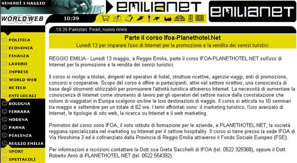 REGGIO EMILIA - Lunedì 13 maggio , a Reggio Emilia, parte il corso IFOA - PLANETHOTEL.NET sull'uso di Internet per la promozione e la vendita di servizi turistici.