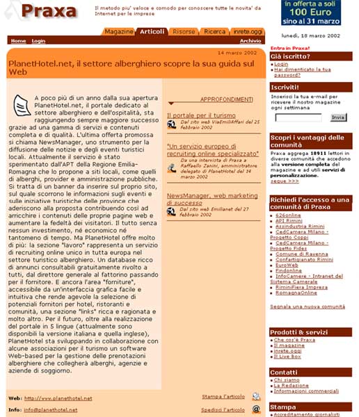 A poco più di un anno dalla sua apertura PlanetHotel.net, il portale dedicato al settore alberghiero e dell'ospitalità, sta raggiungendo sempre maggiore successo grazie ad una gamma di servizi e contenuti completa e di qualità. L'ultima offerta promossa si chiama NewsManager, uno strumento per la diffusione delle notizie e degli eventi turistici locali. Attualmente il servizio è stato sperimentato dall'APT della Regione Emilia-Romagna che lo propone a siti locali, come quelli di alberghi, provider e amministrazione pubbliche. Si tratta di un banner da inserire sul proprio sito, sul quale scorrono le informazioni sugli eventi e sulle iniziative turistiche delle province che aderiscono alla proposta contribuendo così ad arricchire i contenuti delle proprie pagine web e aumentare la fedeltà dei visitatori. Il tutto senza nessun investimento, né economico né tantomeno di tempo. Ma PlanetHotel offre molto di più: la sezione "lavoro" rappresenta un servizio di recruiting online unico in tutta europa nel settore turistico alberghiero. Un database ricco di annunci consultabili gratuitamente rivolto a tutti, dal direttore generale al fattorino passando per il fornitore. E ancora l'area "forniture", accessibile da un'interfaccia grafica facile e intuitiva che rende agevole la selezione di potenziali fornitori per hotel, ristoranti e comunità, una sezione "links" ricca e ragionata e molto altro. Per il futuro, oltre alla realizzazione del portale in 5 lingue (attualmente sono disponibili la versione italiana e quella inglese), PlanetHotel sta sviluppando in collaborazione con alcune associazioni per il turismo un software Web-based per la gestione delle prenotazioni alberghiere che collegherà alberghi, agenzie e aziende di soggiorno.